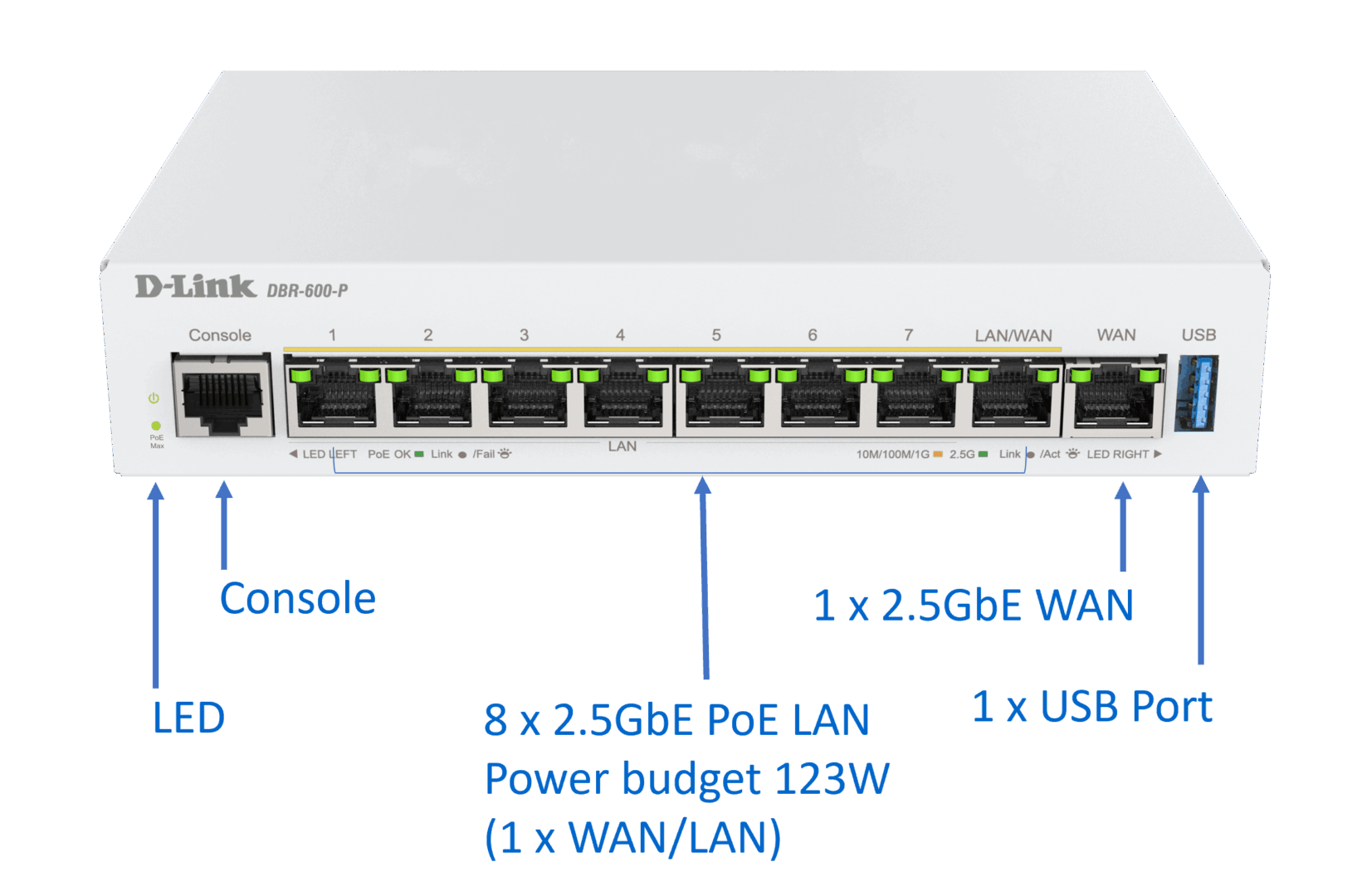 • 8 puertos 2.5 Gigabit PoE (1 puerto WAN/LAN configurable)